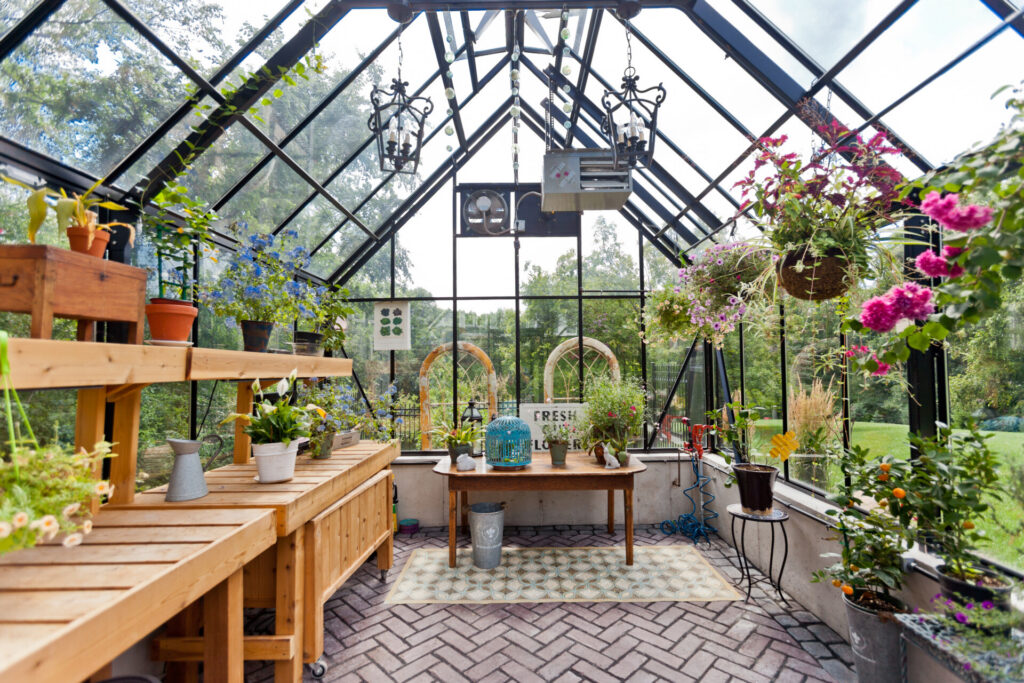 Once the greenhouse structure is chosen, the interior framework of benches and shelving brings the space to life.
