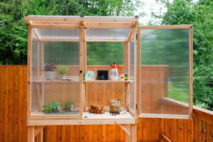 Handmade from Western Red Cedar and clear twin-wall polycarbonate, this upright cold frame doubles as a potting bench and protected growing space, perfect for patios, decks, or small yards.